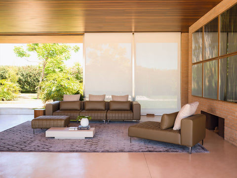 - A complete modular layout that combines sofa, chaise, and ottoman modules together, allowing for a dynamic and sculptural seating composition.