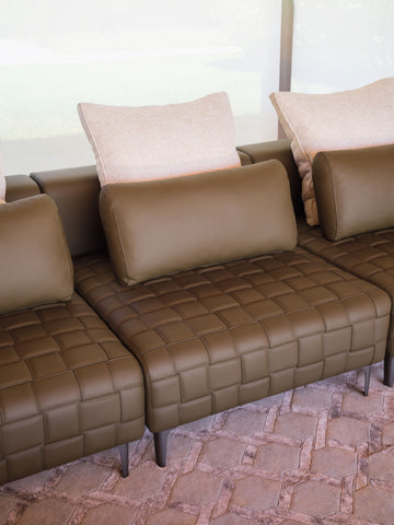 The Artigiano Module collection is a refined expression of craftsmanship and contemporary design, defined by its distinctive hand-woven detailing. Each piece features leather, suede, or fabric strips meticulously woven into the padded structure, creating a tactile, layered surface that blends artisanal technique with modern form. This intricate weave adds depth, texture, and visual interest, making the Artigiano Module an elegant focal point in any space.The collection is built on a foundation of clean lines and thoughtful materiality. The seat is designed with a tight cushion construction, offering a crisp and tailored silhouette. Slim metal legs elevate the profile and can be customized in a range of finishes to suit your interior style, providing both stability and a subtle architectural accent.