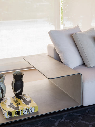 - Leather-wrapped table trays that can be specified at the time of order and integrated into any selected piece. Multiple trays can be added to extend the usable surface area for drinks, books, or decorative objects.