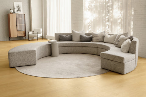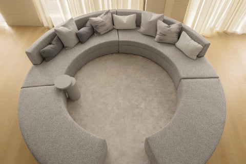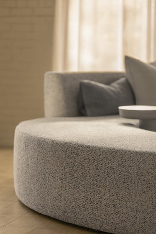 O estofamento é finalizado com acabamento de debrum elegante e costuras inspiradas em alta costura, que realçam as linhas limpas e a forma circular característica do sofá.